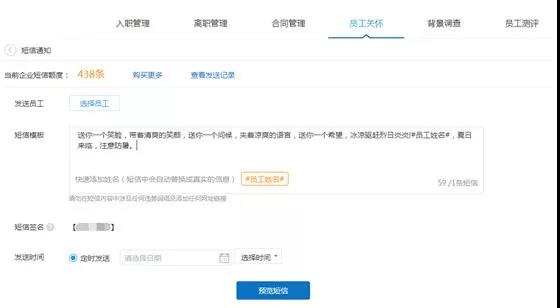 結(jié)合短信通知功能,我們提前編輯好祝福信息或通知,系統(tǒng)到期自動(dòng)發(fā)放,且短信是包 含企業(yè)簽名的。而提前收到通知的人事也有充足的時(shí)間給員工準(zhǔn)備相關(guān)活動(dòng)或禮物,大幅度 增強(qiáng)歸屬感。