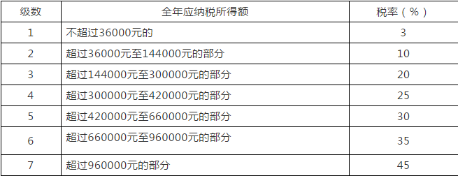 (注1:本表所稱全年應(yīng)納稅所得額是指依照本法第六條的規(guī)定,居民個(gè)人取得綜合所得以每一納稅年度收入額減除費(fèi)用六萬元以及專項(xiàng)扣除、專項(xiàng)附加扣除和依法確定的其他扣除后的余額。