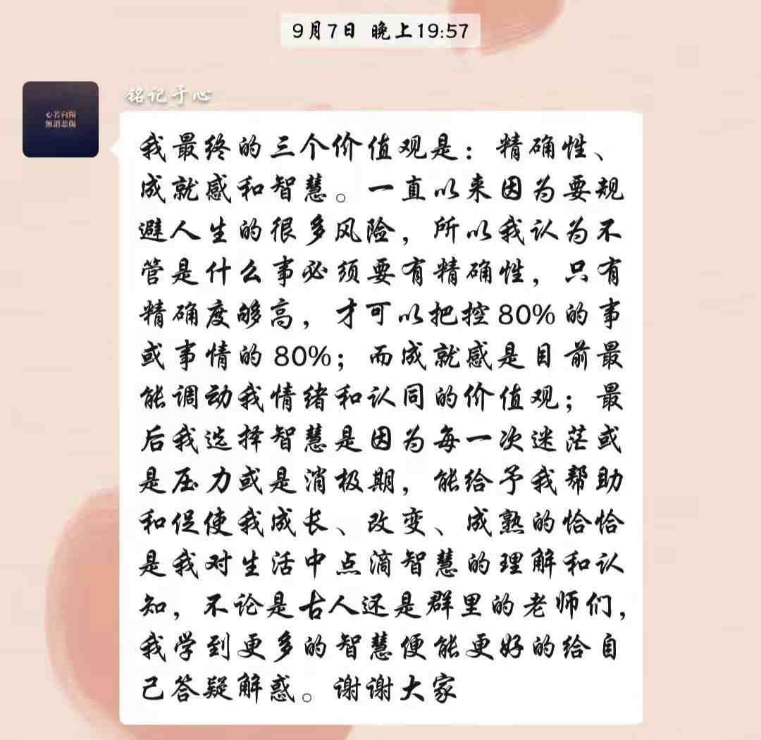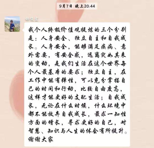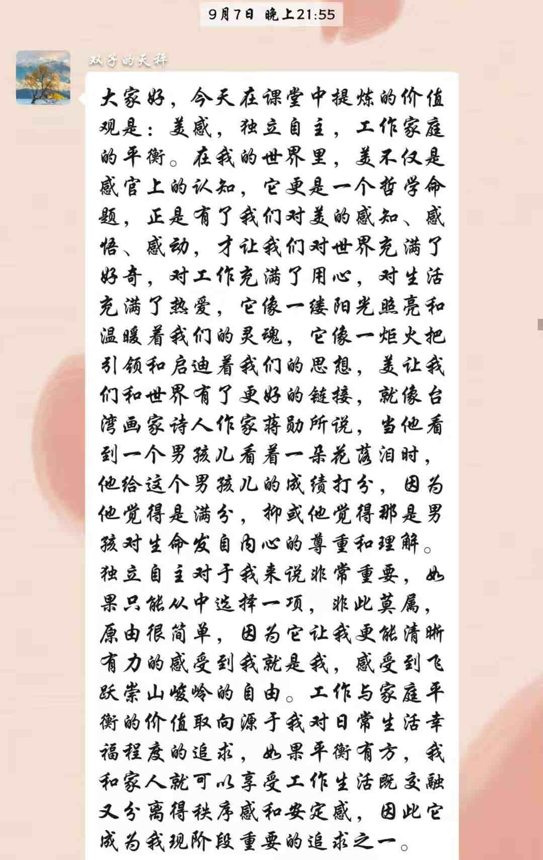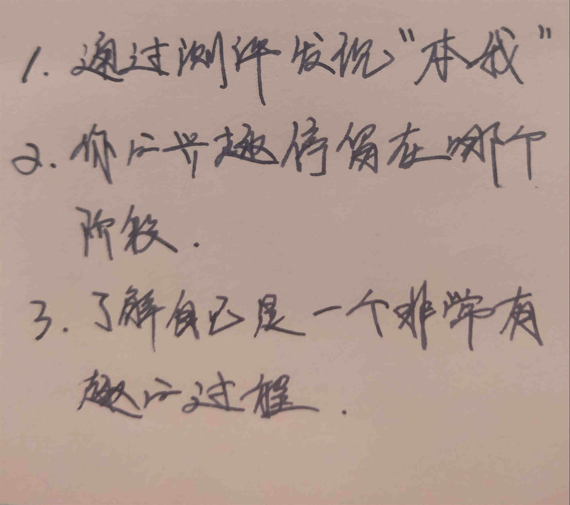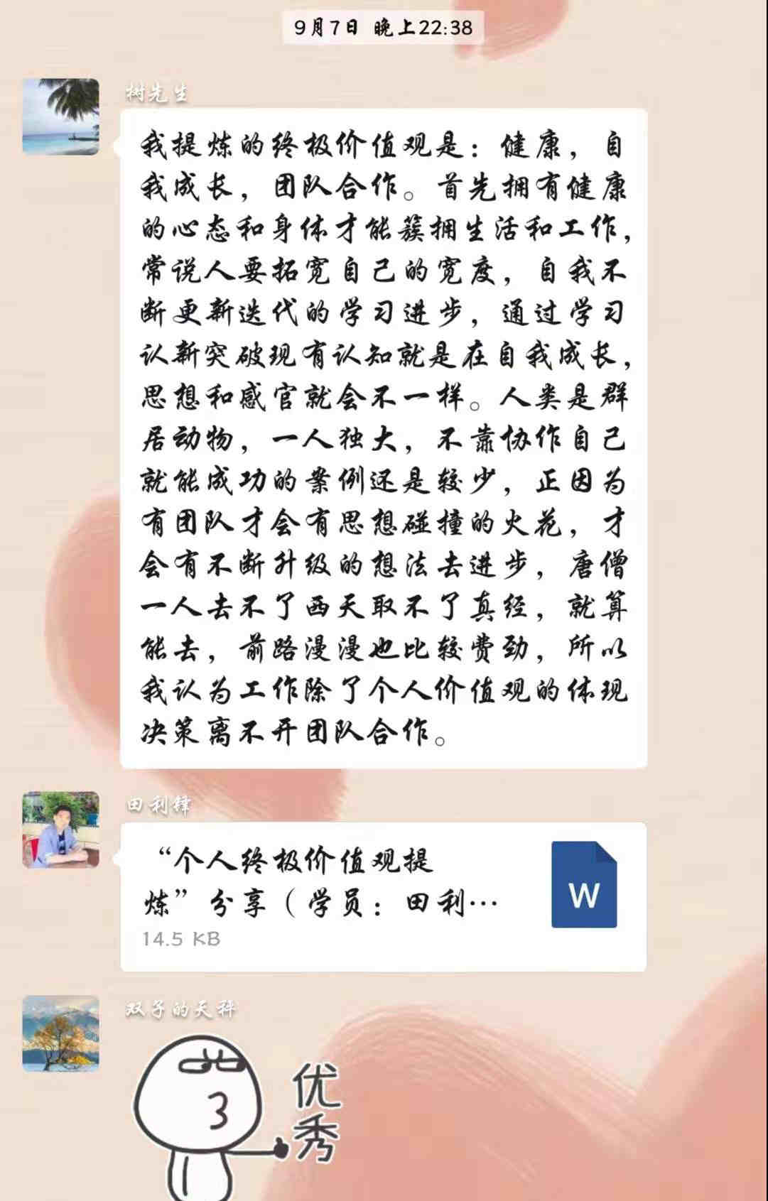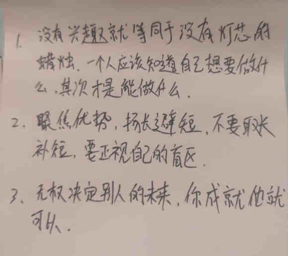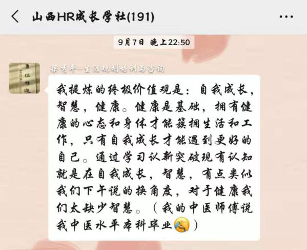 短暫的午間小憩后由明星學(xué)員杜春帶領(lǐng)著大家跳了一曲“蹦沙卡拉”,滿滿的激情與能量,各位學(xué)員再次滿血復(fù)活投入到了下午的課程當中。性格、興趣、勝任能力都充分了解后,怎樣才能走向職業(yè)巔峰呢?緊接著又一波測試來襲——價值觀測試,36個價值觀重視程度的選擇,8個非常重視再次層層篩選,***后每位學(xué)員都得到了自己的3個******價值觀,果然一千個人心中會有一千個哈姆雷特,大家互相分享著自己的選擇,激烈的討論著自己的******價值觀,課后依然回味無窮。