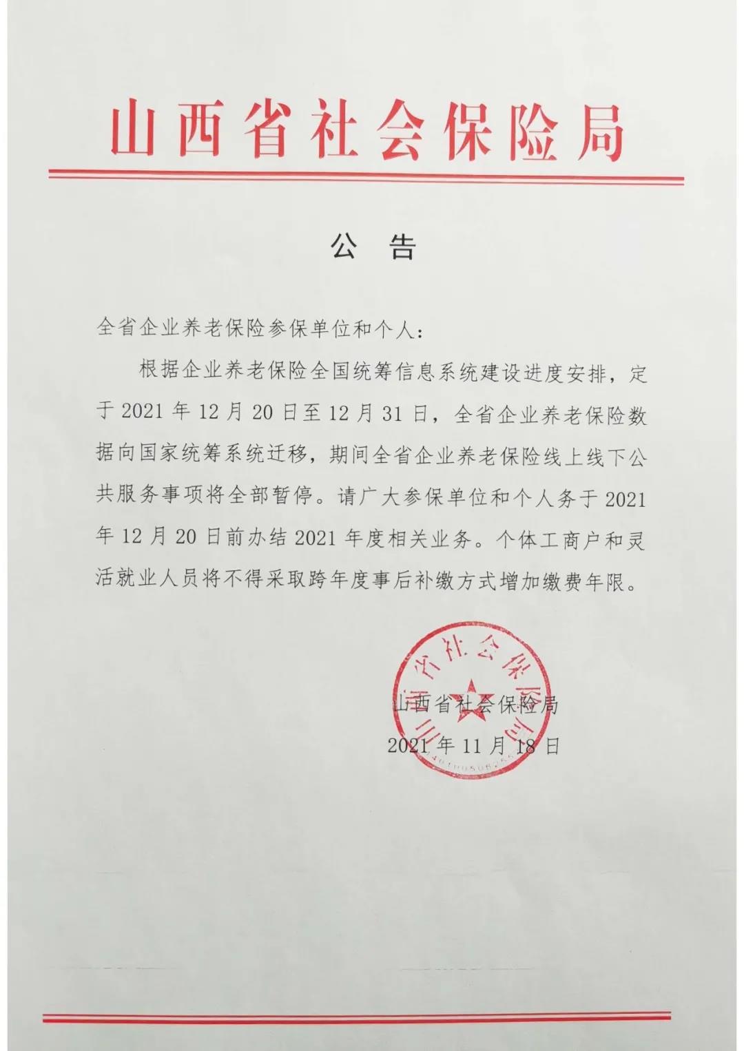 根據(jù)企業(yè)養(yǎng)老保險(xiǎn)全國統(tǒng)籌信息系統(tǒng)建設(shè)進(jìn)度安排,定于2021年12月20日至12月31日,全省企業(yè)養(yǎng)老保險(xiǎn)數(shù)據(jù)向國家統(tǒng)籌系統(tǒng)遷移,期間全省企業(yè)養(yǎng)老保險(xiǎn)線上線下公共服務(wù)事項(xiàng)將全部暫停。請廣大參保單位和個(gè)人務(wù)于2021年12月20日前辦結(jié)2021年度相關(guān)業(yè)務(wù)。個(gè)體工商戶和靈活就業(yè)人員將不得采取跨年度事后補(bǔ)繳方式增加繳費(fèi)年限。