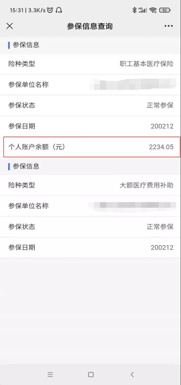 第三步 “參保信息查詢(xún)”頁(yè)面會(huì)詳細(xì)記錄個(gè)人參保信息,職工基本醫(yī)療保險(xiǎn)個(gè)人賬戶(hù)余額會(huì)顯示在該條參保信息下的***后一行。