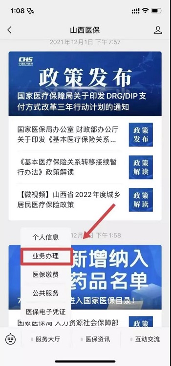 ******步 微信搜索“山西醫(yī)保”公眾號并關(guān)注,進入公眾號并點擊“服務(wù)大廳”選擇“業(yè)務(wù)辦理”模塊。