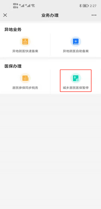 第二步 點擊“業(yè)務(wù)辦理”中右下角的“城鄉(xiāng)居民醫(yī)保暫停”。