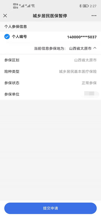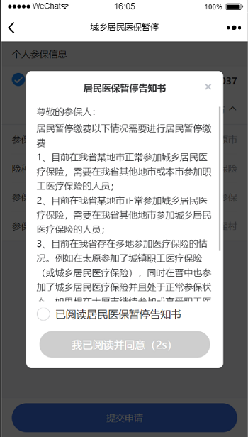 選擇需要操作的城鄉(xiāng)居民基本醫(yī)療保險項點擊“提交申請”按鈕。