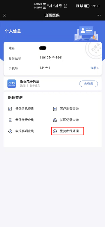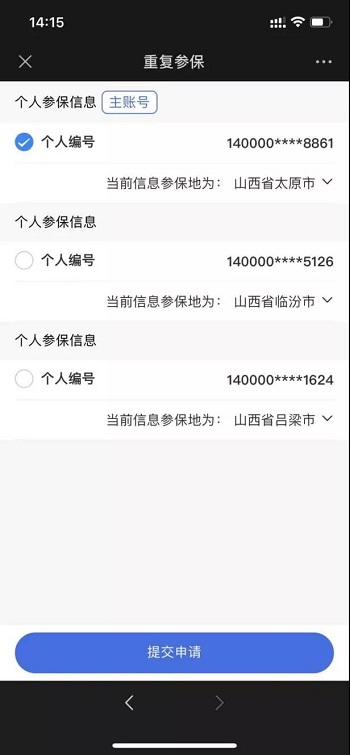 場景三、目前在我省存在多地參加醫(yī)療保險的情況。例如在太原參加了城鎮(zhèn)職工醫(yī)療保險(或城鄉(xiāng)居民醫(yī)療保險),同時在呂梁也參加了城鄉(xiāng)居民醫(yī)療保險并且處于正常參保狀態(tài)。如果想在太原市繼續(xù)參加職工醫(yī)療保險(或城鄉(xiāng)居民醫(yī)療保險),則需要首先暫停呂梁的城鄉(xiāng)居民醫(yī)療保險,然后在公眾號上“個人信息”頁面點擊“重復(fù)參保處理”中設(shè)置太原參保信息為主賬號信息。