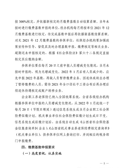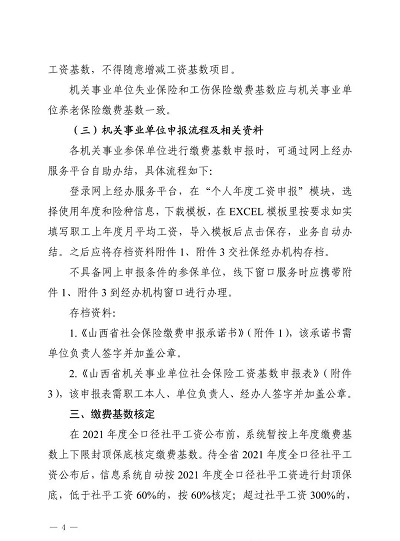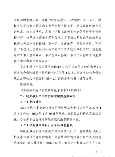 根據(jù)《山西省人力資源和社會保障廳山西省財政廳關于規(guī)范完善省級統(tǒng)籌統(tǒng)一企業(yè)職工基本養(yǎng)老保險相關政策的通知》(晉人社廳發(fā)〔2019]56號)《山西省人力資源和社會保障廳關于印發(fā)<山西省完善企業(yè)職工基本養(yǎng)老保險省級統(tǒng)籌業(yè)務經(jīng)辦規(guī)程(試行)>的通知》(晉人社廳發(fā)〔2019]63號)《山西省人力資源和社會保障廳關于印發(fā)<機關事業(yè)單位工作人員基本養(yǎng)老保險經(jīng)辦規(guī)程>的通知》(晉人社廳發(fā)〔2015]94號)和《山西省社會保險局關于全省實行多險種統(tǒng)一申報核定有關事項的通知》(晉社保局發(fā)〔2021]10號)等文件規(guī)定,為做好2022年社會保險(即企業(yè)職工養(yǎng)老保險、機關事業(yè)單位養(yǎng)老保險、失業(yè)保險和工傷保險)繳費基數(shù)申報工作,現(xiàn)將有關事項通知如下: