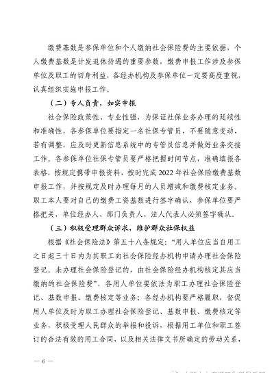 社會保險政策性、專業(yè)性強,為保證社保業(yè)務辦理的延續(xù)性和準確性,各參保單位要指定一名社保專管員,不要隨意變動,若有調(diào)整,應及時更新信息系統(tǒng)中的專管員信息并做好業(yè)務交接工作。各參保單位社保專管員要嚴格把握時間節(jié)點,準確填報各表格,按規(guī)定攜帶申報資料,按時完成2022年社會保險繳費基數(shù)申報工作,并按規(guī)定及時辦理每月的人員增減和繳費核定業(yè)務。職工本人要對自己的繳費工資基數(shù)進行簽字確認,參保單位要嚴格把關,單位經(jīng)辦人、部門負責人、法人代表人必須簽字確認。