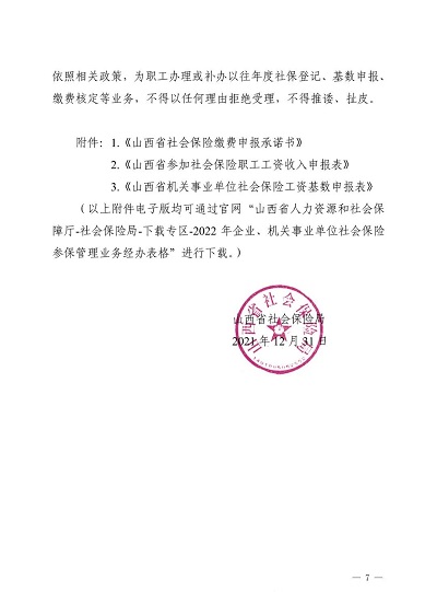 (以上附件電子版均可通過官網(wǎng)“山西省人力資源和社會保障廳-社會保險局-下載專區(qū)-2022年企業(yè)、機關事業(yè)單位社會保險參保管理業(yè)務經(jīng)辦表格”進行下載。)
