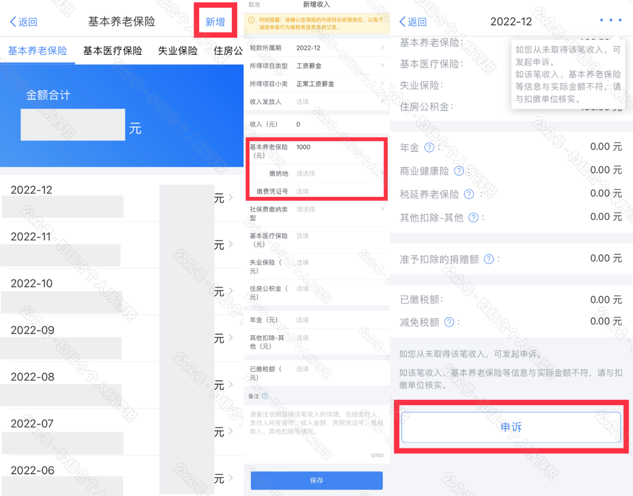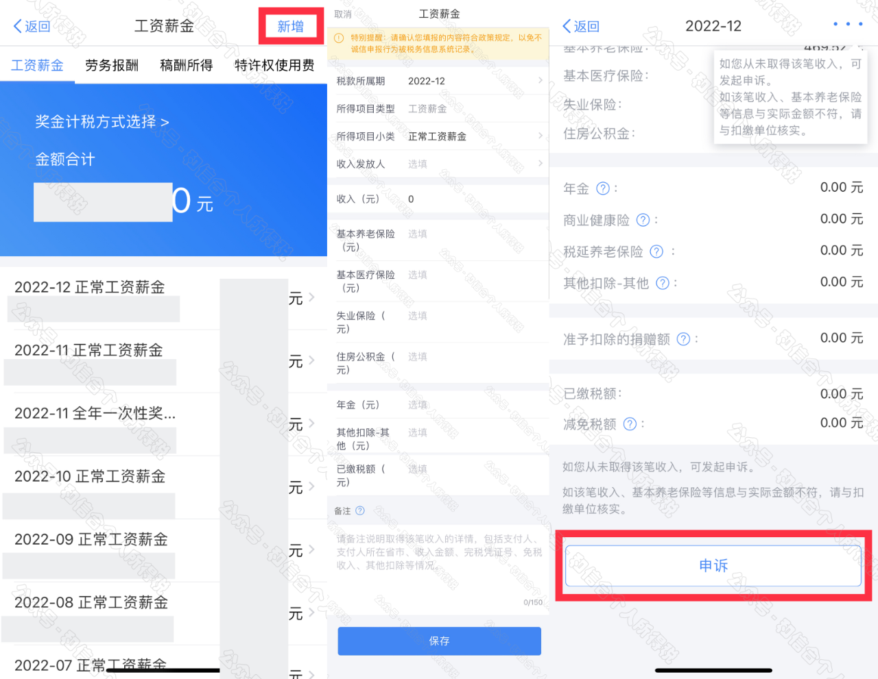 在專項(xiàng)扣除列表界面,您可分項(xiàng)目進(jìn)行新增和申訴。