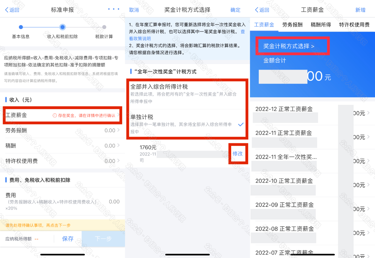 年度匯算時(shí),如您選擇將全年一次性獎(jiǎng)金合并至綜合所得計(jì)稅的,或者有多筆全年一次性獎(jiǎng)金的,可通過(guò)【獎(jiǎng)金計(jì)稅方式選擇】進(jìn)行設(shè)置。