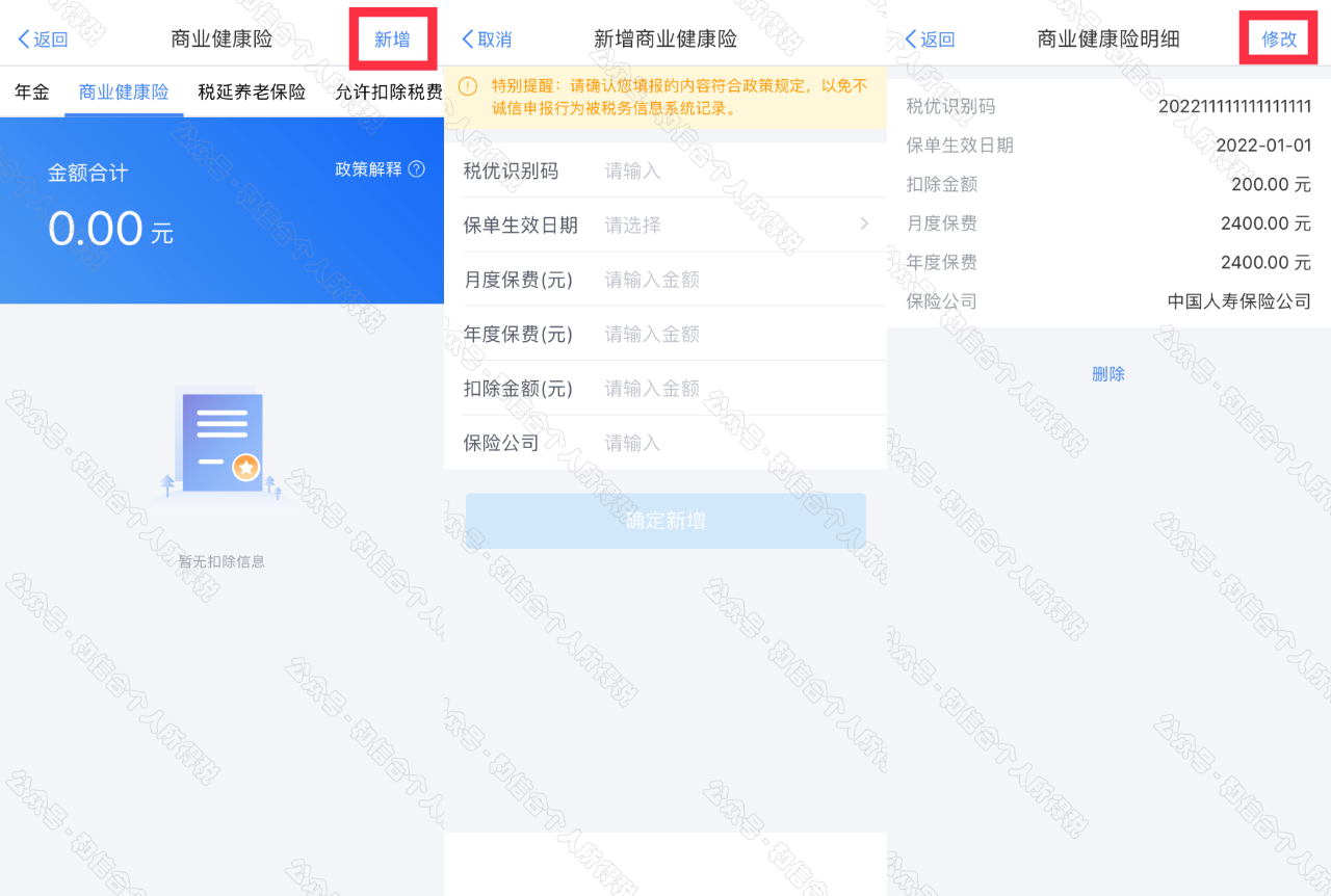 在其他扣除明細(xì)列表界面,您可點(diǎn)擊【商業(yè)健康險(xiǎn)】、【稅收遞延養(yǎng)老保險(xiǎn)】頁(yè)面,分別進(jìn)行新增和修改。