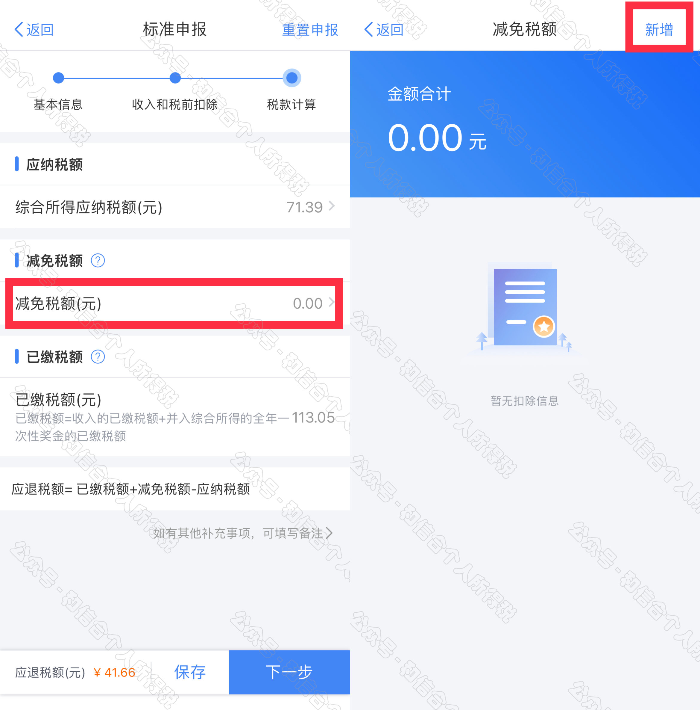 如您有減免稅事項(xiàng)(殘疾、孤老人員、烈屬),可以點(diǎn)擊【減免稅額】新增相關(guān)信息。確認(rèn)結(jié)果后,點(diǎn)擊【提交申報(bào)】。