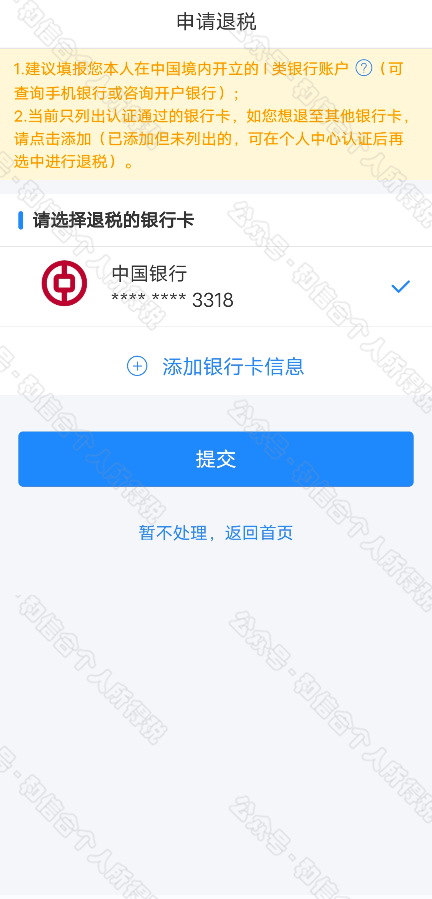 如果您的銀行卡不在身邊,或者暫時(shí)不想退稅,可以點(diǎn)擊【暫不處理,返回首頁(yè)】,后續(xù)可再次發(fā)起退稅申請(qǐng)。