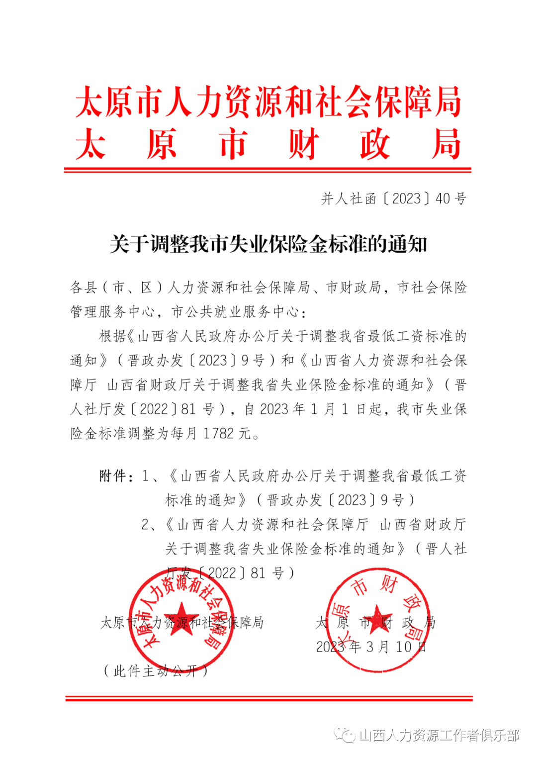 根據(jù)《山西省人民政府辦公廳關(guān)于調(diào)整我省******工資標準的通知》(晉政辦發(fā)〔2023〕9號)和《山西省人力資源和社會保障廳 山西省財政廳關(guān)于調(diào)整我省失業(yè)保險金標準的通知》(晉人社廳發(fā)〔2022〕81號),自2023年1月1日起,我市失業(yè)保險金標準調(diào)整為每月1782元。