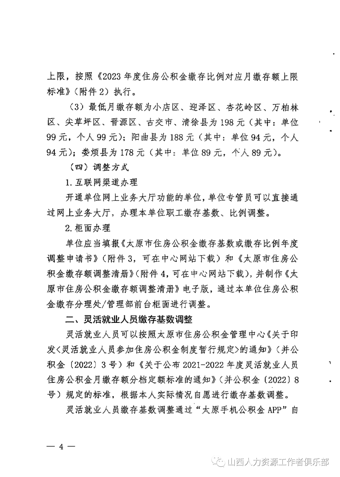 (4) 繳存基數(shù)實行上下限控制。按照太原市統(tǒng)計部門公布的 2022 年大原市城鎮(zhèn)非私營單位就業(yè)人員年平均工資103008 元計算,本年度繳存基數(shù)上限為25752元;根據(jù)《山西省人民政府 辦公廳關于調(diào)整我省******工資標準的通知》(晉政辦發(fā)〔2023:1 9 號)規(guī)定,本年度繳存基數(shù)下限為小店區(qū)、迎澤區(qū)、杏花嶺區(qū)、 萬柏林區(qū)、尖草坪區(qū)、晉源區(qū)、古交市、清徐縣 1980 元;陽曲 縣 1880 元;婁煩縣 1780 元。