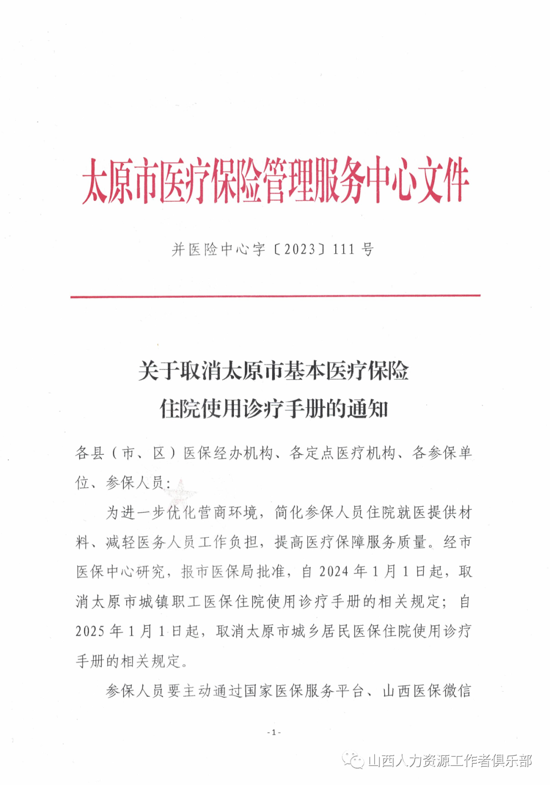 2025年1月1日起,取消太原市基本醫(yī)療保險(xiǎn)住院使用診療手冊(cè)的通知