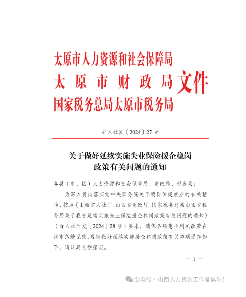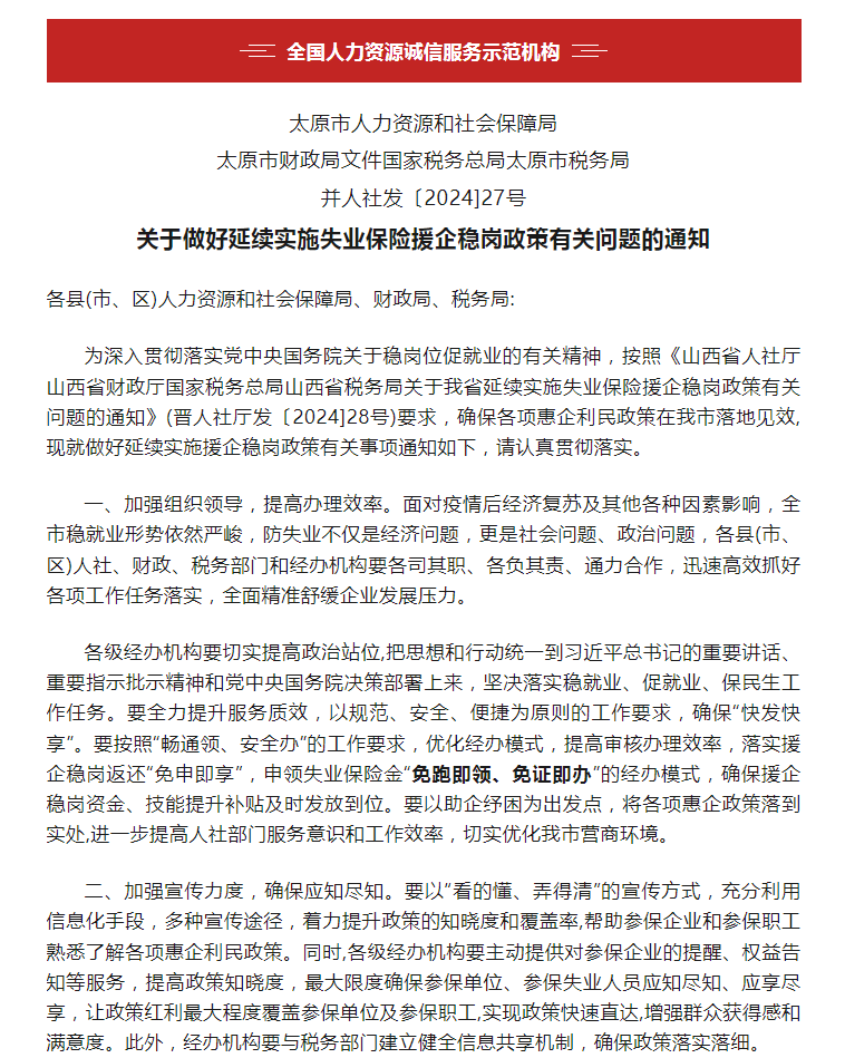 太原市文件:關(guān)于做好延續(xù)實(shí)施失業(yè)保險(xiǎn)援企穩(wěn)崗政策有關(guān)問(wèn)題的通知(附紅頭文件)