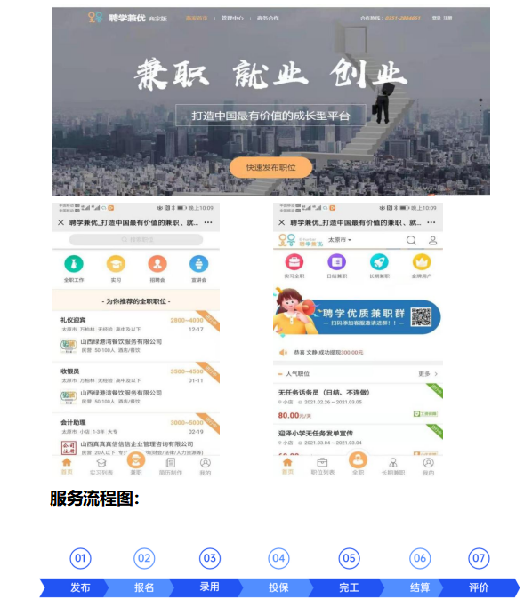 公司致力于打造山西靈活用工的領軍企業(yè)、“山西酒店餐飲靈活用工******勞務品牌”,實現(xiàn)酒店服務員、房嫂的真派遣。目前公司“聘學兼優(yōu)”靈活用工兼職平臺注冊兼職大學生有12萬余人、社會兼職群體4萬余人,是山西本土注冊人數(shù)***多、兼職服務頻次***勤、技術更新及時好用的靈活用工互聯(lián)網(wǎng)平臺。