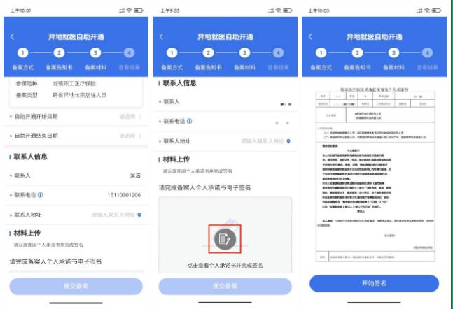 4.選擇“跨省異地長期居住人員”備案的參保人員,填寫“自助開通開始時間”、“自助開通結(jié)束時間”、“聯(lián)系人”、“聯(lián)系電話”、“聯(lián)系人地址”信息后,“點擊查看個人承諾書并完成簽名”→“開始簽名”。