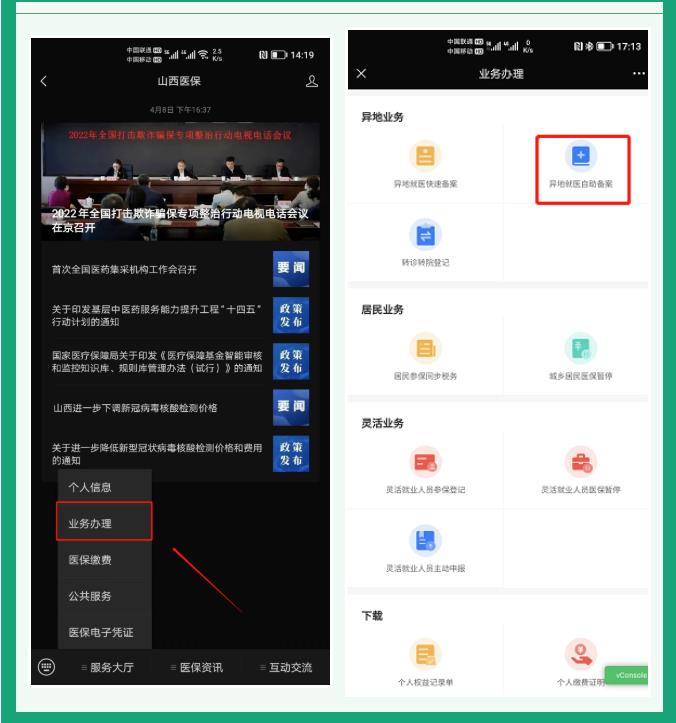 2.返回公眾號首頁,點擊”服務大廳”,選擇”業(yè)務辦理”,進入”異地就醫(yī)自助備案”模塊。