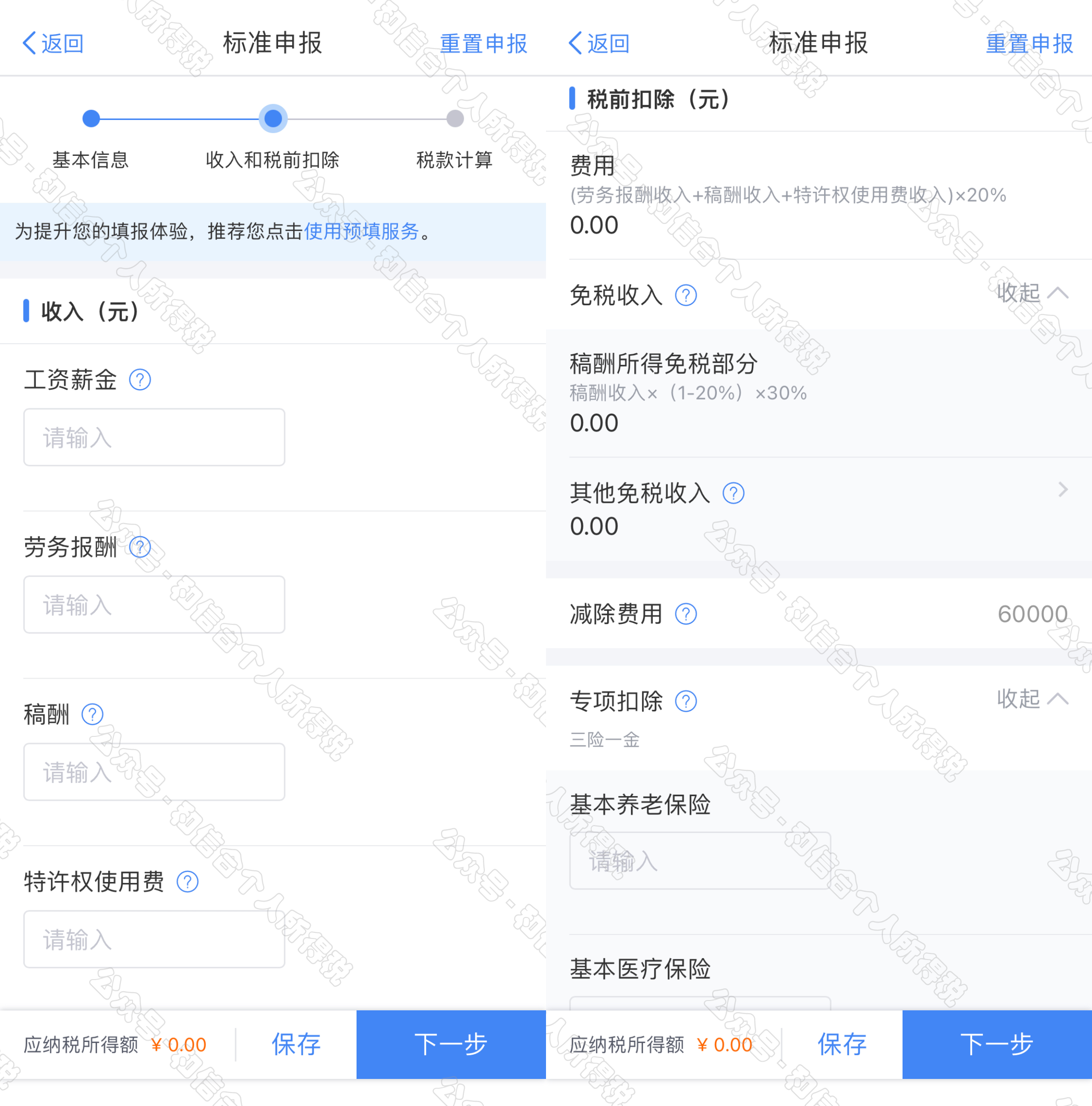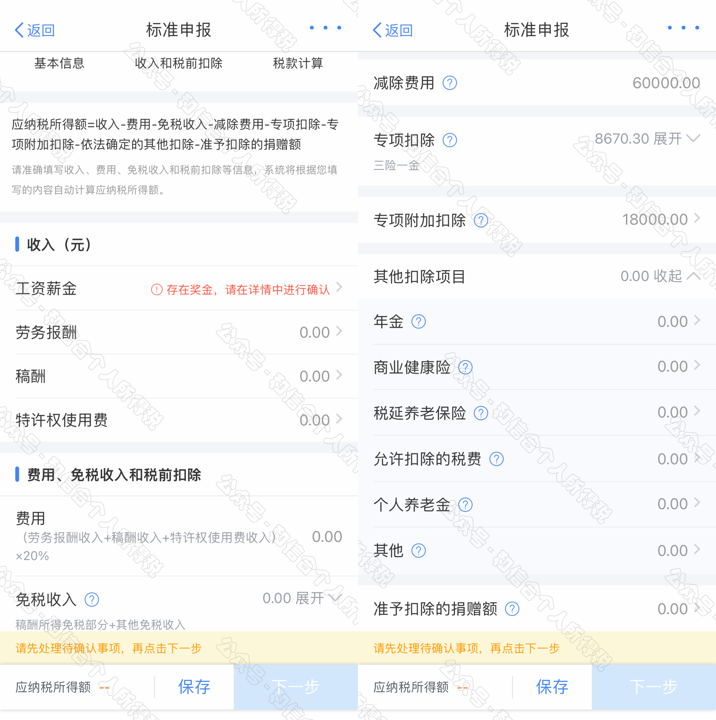 商業(yè)健康險(xiǎn)、稅收遞延養(yǎng)老保險(xiǎn)、準(zhǔn)予扣除的捐贈(zèng)額、減免稅額需先填寫附表,填寫后相關(guān)信息帶入主表。主表不能直接填寫。